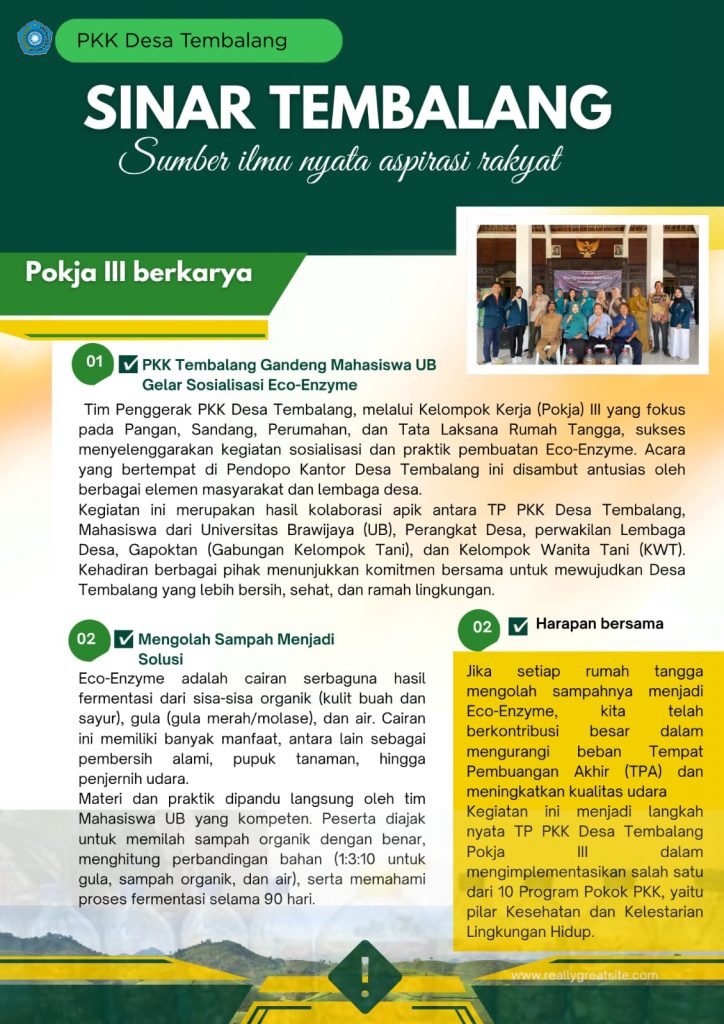Kegiatan ini merupakan hasil kolaborasi apik antara TP PKK Desa Tembalang, Mahasiswa dari Universitas Brawijaya (UB), Perangkat Desa, Perwakilan Lembaga Desa, Gapoktan (Gabungan Kelompok Tani), dan Kelompok Wanita Tani (KWT). kehadiran berbagai pihak menunjukkan komitmen bersama untuk mewujudkan Desa Tembalang yang lebih bersih, Sehat, dan ramah lingkungan.