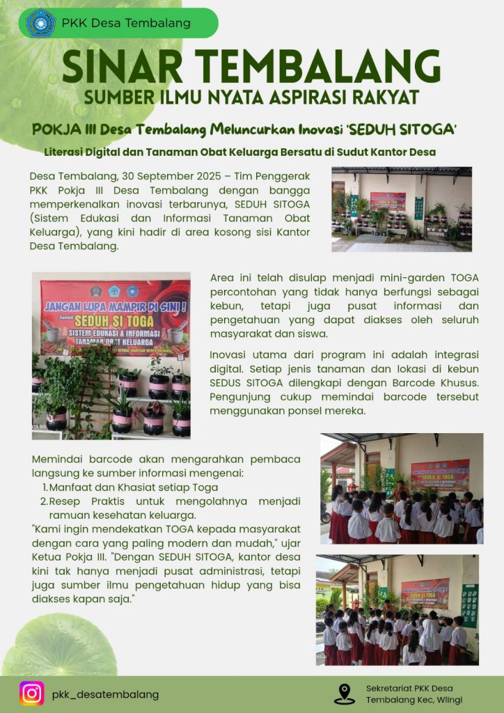 Tim Penggerak PKK Pokja III Desa Tembalang dengan bangga memperkenalkan inovasi terbarunya, SEDUH SITOGA ( sistem edukasi dan informasi tanaman obat keluarga), yang kini hadir di area kosong sisi kantor.