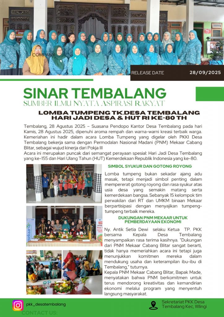 pada tanggal 28 Agutus 2025 Penggerak PKK yaitu Pokja III mengadakan acara lomba tumpeng dengan bekerja sama dengan Permodalan Nasional Madani (PNM) cabang Blitar, acara ini merupakan puncak dari semangat perayaan sepesial : hari jadi Desa Tembalang yang ke 155 dan hari ulang tahun (HUT ) kemerdekaan republik Indonesia yang ke – 80.